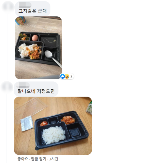 격리된 군인들의 식판 사진 인증이 줄을 잇자, 누리꾼들은 "국방비가 다 어디로 가나? 애들 밥 갖고 장난치는데 많네" "밥만 저따위로 주는 건 선 넘었지" "누가 봐도 부실한 게 맞잖아" 등의 반응을 보이면서 비판하고 있다.