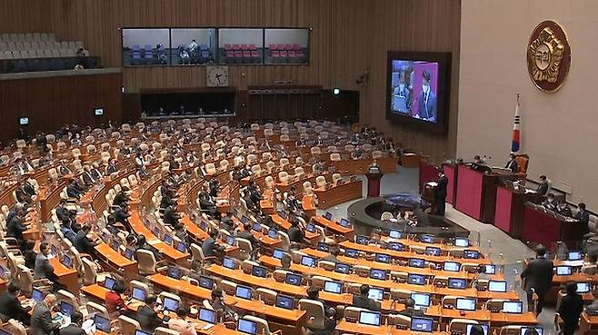 앞서 어제 대정부질문은 더불어민주당 소속 김상희 국회부의장의 "아주 신났네, 신났어" 발언에 대해 국민의힘 의원들이 반발하며 집단퇴장했습니다.