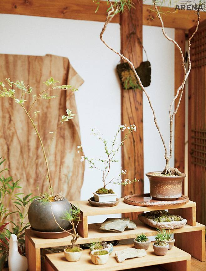 분재 분재 식물은 은은한 빛보다는 강한 빛을 좋아한다. 그래서 계절의 변화를 그대로 느낄 수 있는 환경에서 키우는 게 좋다. 분재 관리에는 많은 정성을 들여야 한다. 지속적인 가지치기와 다듬기는 필수다. 하지만 분재 식물은 작은 크기를 유지해 어디에 놓아도 오브제로서 역할을 톡톡히 한다.
