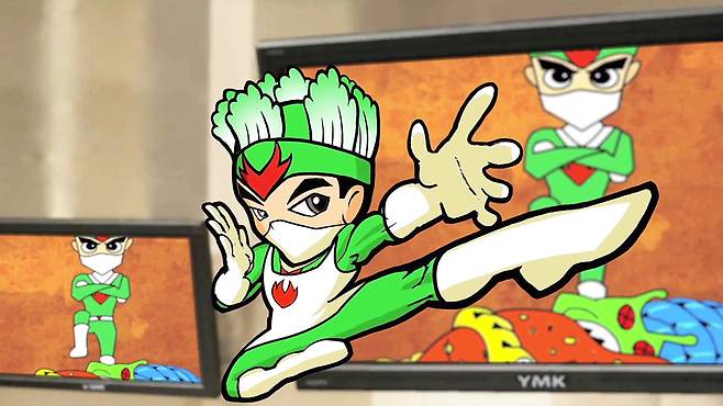 배추 모양의 머리와 고추의 매운맛을 연상시키는 불꽃 모양, 지난 2009년 김치 홍보를 위해 만들어진 애니메이션 캐릭터 김치전사입니다.