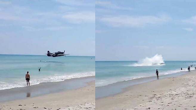 다음 소식은 미국 이야기입니다. 미국 플로리다에서 에어쇼에 참가한 비행기가 사람들이 많은 해수욕장으로 비상 착륙하는 아찔한 일이 벌어졌습니다.
