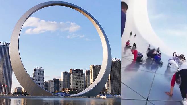 이를 두고 SNS에서는 "마찰열 때문에 찰과상을 입을 수 있다", "조형물이 너무 높아, 구르다 넘어지면 크게 다칠 수 있다"는 지적이 제기됐고, 현지 당국은 뒤늦게 조형물 주위에 울타리를 설치하겠다고 발표했습니다.