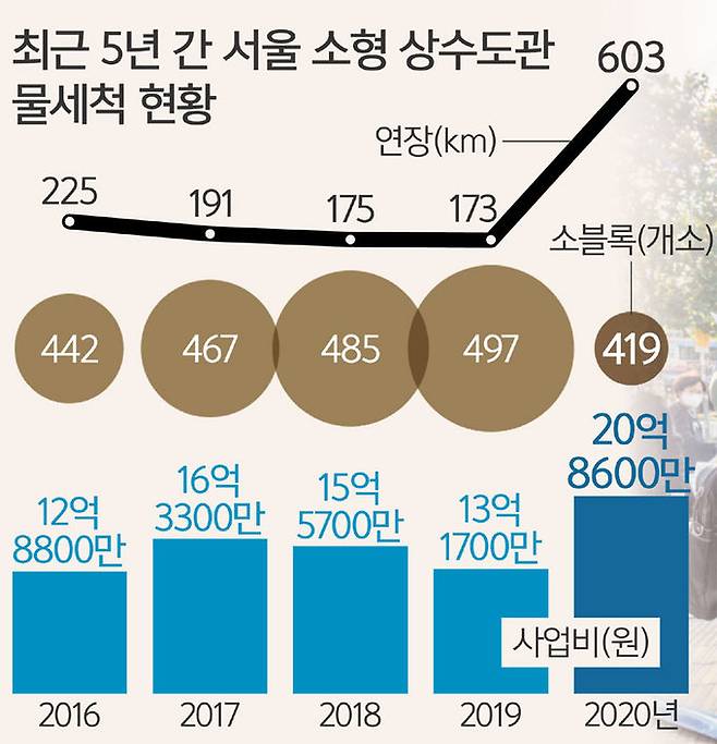 서울시는 이보다 1년 앞선 지난해부터 대형 상수도관 정비계획을 세웠다. 2019년 6월 문래동 수질 사고를 계기로 대형 수도관 관리의 중요성을 인식해서다. 문래동 수질 사고는 영등포구청역∼도림교 간 직경 800㎜의 배수본관 노후화(1973년 부설)로 일대 학교·아파트에서 혼탁수가 발생한 것을 말한다.