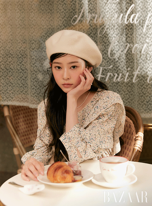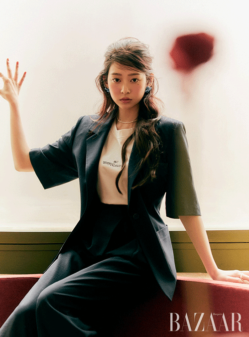차세대 워너비 아이콘으로 자리매김하고 있는 민주는 다채로운 패턴의 아이템뿐만 아니라 유러피언 감성을 담은 베이지 컬러 리넨 블렌드 헤링본 노칼라 재킷과 셋업 쇼츠 등 시크한 아이템도 완벽히 소화해냈다. (사진=하퍼스 바자 코리아 Harper’s BAZAAR)