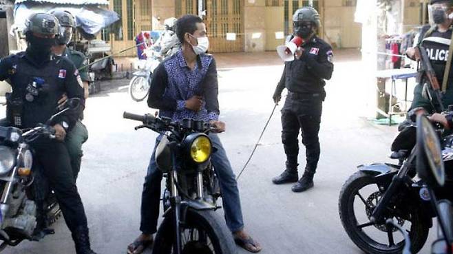 일간 크메르타임스 등은 어제(21일) 페이스북에 캄보디아 경찰관이 통행 금지령을 위반한 시민을 때리려고 등나무 회초리를 들고 있는 사진이 올라왔다고 보도했습니다.