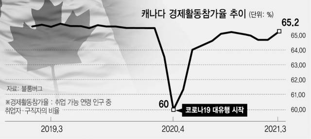 캐나다가 테이퍼링에 나선 것은 경제가 빠르게 회복하고 있다는 판단 때문이다. 이날 BOC는 올해 성장률로 이전 예측치보다 2.5%포인트 상향한 6.5%를 제시했다. 캐나다 기업과 가계가 팬데믹에 예상보다 탄력적으로 적응하고 있다는 이유에서다. 특히 고용 시장의 회복세가 눈에 띈다. 취업 가능 연령 인구 중 취업자와 구직자가 차지하는 비율인 경제활동참가율은 지난달 65.2%를 기록해 팬데믹 직전 수준(65.5%)까지 따라잡았다. 안정적인 일자리로 분류되는 정규직 일자리도 지난달 17만 5,400명 늘었다. 2월 증가분(8만 8,200명)보다 두 배 가까이 증가한 것이다.