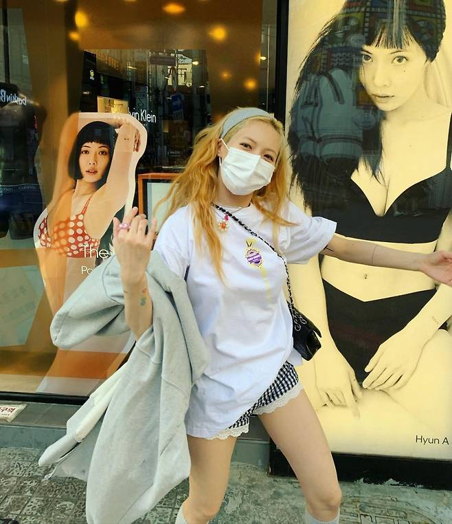 공개된 사진 속 현아는 자신이 브랜드 모델로 활동하고 있는 한 속옷 브랜드 가게에 장식된 자신의 속옷 화보를 마주했다.