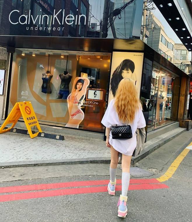 가수 현아가 자신의 속옷 광고 앞에서 인증 사진을 찍었다.