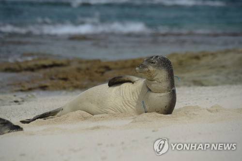 In this April 3, 2021 photo provided by Matthew Chauvin, a female endangered Hawaiian monk seal is entangled in derelict fishing gear on the shores of Laysan Island in the Northwestern Hawaiian Islands. A crew has returned from the northernmost islands in the Hawaiian archipelago with a boatload of marine plastic and abandoned fishing nets that threaten to entangle endangered Hawaiian monk seals and other animals. The cleanup effort in the nation's largest protected marine reserve lasted three weeks and the crew picked up more than 47 tons of “ghost nets” and other marine plastics. (Matthew Chauvin, Papahanaumokuakea Marine Debris Project via AP — NOAA/NMFS Permit No. 22677) MUST INCLUDE: NOAA/NMFS Permit No. 22677 Copyright release sent to NYC.