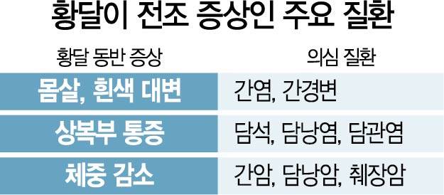 대체로 간 기능의 이상에 의해 생기는 황달은 당장에 심각한 문제를 일으키지 않기 때문에 대수롭지 않게 여기기 쉽다. 눈 흰자나 얼굴이 노란 빛을 띠어도 그저 “얼마나 귤을 많이 먹었으면 이렇게 누렇게 떴느냐”고 핀잔을 주고 넘어가기 일쑤다. 문제는 황달 그 자체가 아니라 황달이 담도암과 췌장암 등 치명적인 각종 질환의 전조 증상일 수도 있다는 점이다. 황달이 복부 통증이나 대변 색 변화 등의 증상과 같이 나타나면 담석, 담낭·담관염, 간염 등을 의심할 수도 있다.