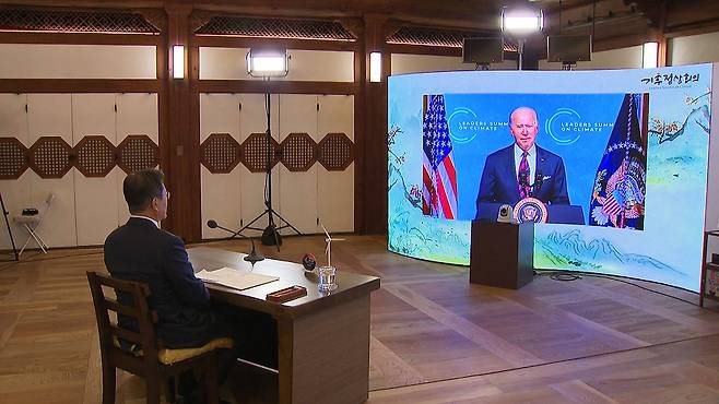 기후변화 대책을 논의하기 위한 전 세계 40개국 정상들의 화상회의에서 바이든 미국 대통령은 2030년까지 온실가스 배출을 절반으로 낮추겠다고 선언했습니다. 문재인 대통령을 비롯한 다른 나라 정상들도 이에 호응했지만, 중국과 러시아는 미묘한 온도 차를 보였습니다.