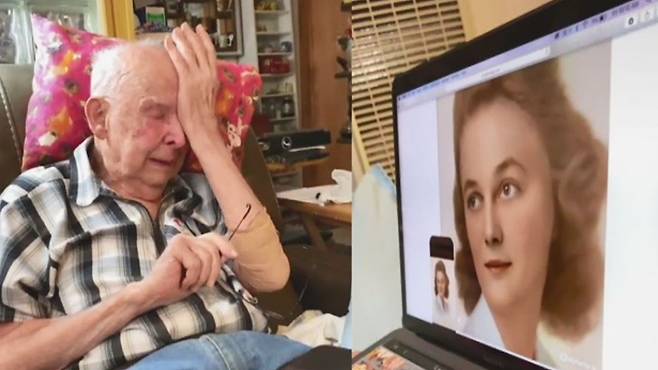 할아버지는 수십 년 세월을 함께했던 아내의 젊은 시절 얼굴을 마주하자 눈물을 감출 수 없었습니다.