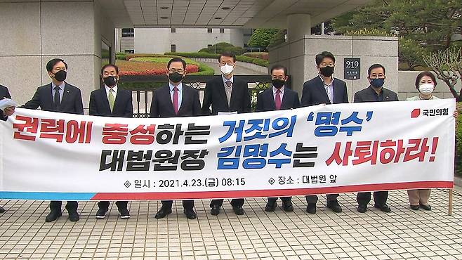 국민의힘 의원들이 오늘(23일) 아침 대법원청사 정문 입구에 모여들었습니다.