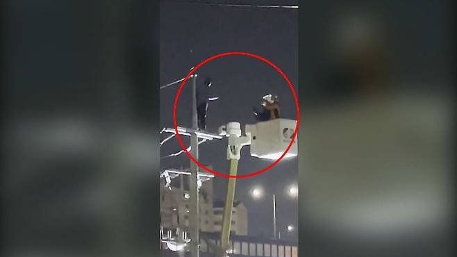 어젯(25일)밤 8시 50분쯤 서울 마포구 성산동의 한 오피스텔 건물 앞 전신주에 술에 취한 남성이 올라갔습니다.
