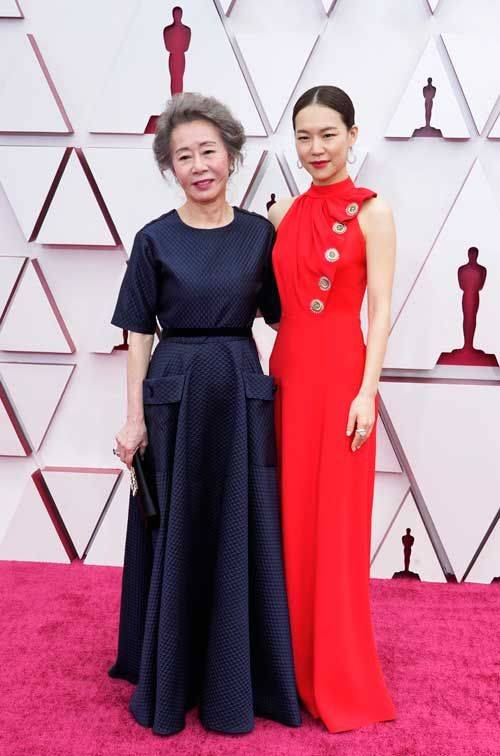 여기에 빨간 드레스를 차려입은 한예리는 윤여정과 대조를 이루면서 레드카펫 무대를 더욱 강렬하게 만들었습니다.