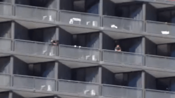 동일 남성은 다시 오른쪽 발코니에 있는 남자에게도 물건을 나누어 준다. 이들은 마스크도 쓰지 않은 상태로 대화를 나누고 자가 격리를 하면서 서로 물건을 공유하는 모습이다. 만약 이들 중 한 명이라도 코로나19 감염자라면 오히려 자가 격리중에 코로나 바이러스가 전염될 수 있는 최악의 상황이다.