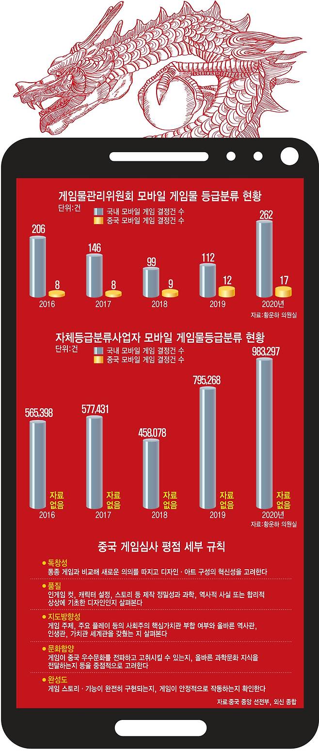 이런 가운데 중국 공산당 입맛에 맞는 게임에만 판호를 주겠다는 움직임은 국내 게임사를 부담스럽게 한다. 다시 인기를 끌고 있는 중국 게임을 통해 잘못된 정보가 국내에 퍼질 위험성 때문이다. 중국음향디지털출판협회 게임 공작 위원회와 중국 게임산업 연구원에 따르면 중국게임 해외매출은 작년 1분기 37억8100만달러에서 4분기 연속 성장해 올해 1분기 40억6400만달러로 증가했다. 중국 게임의 국외 영향력이 커지고 있다는 의미다.