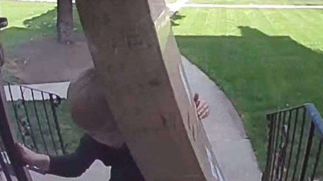 미국에 사는 네 살 맥스가 현관 앞에 놓인 택배 상자를 옮기려고 애를 씁니다.