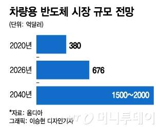 시장조사업체 옴디아에 따르면 전세계 차량용 반도체 시장 규모는 지난해 380억달러(약 42조8000억원)에서 2026년 676억달러(약 76조2000억원)로 확대될 전망이다. 또다른 시장조사업체 가트너에 따르면 자동차 1대에 들어가는 반도체는 2018년 400달러 수준이었지만 자율주행차가 대중화되는 2024년에는 1000달러를 넘을 것으로 예상된다.