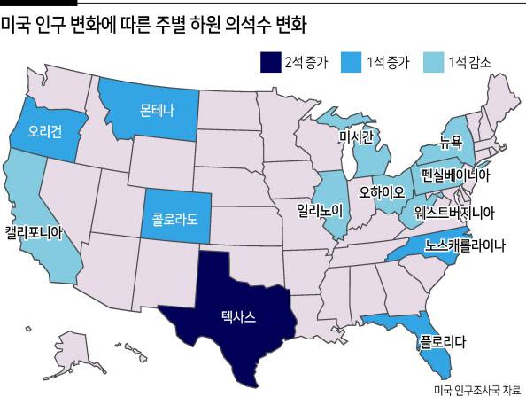구체적으로 텍사스주가 연방 하원 2석이 늘고, 플로리다, 노스캐롤라이나, 콜로라도, 몬태나, 오리건 등 5개 주가 1석씩 증가한다.
