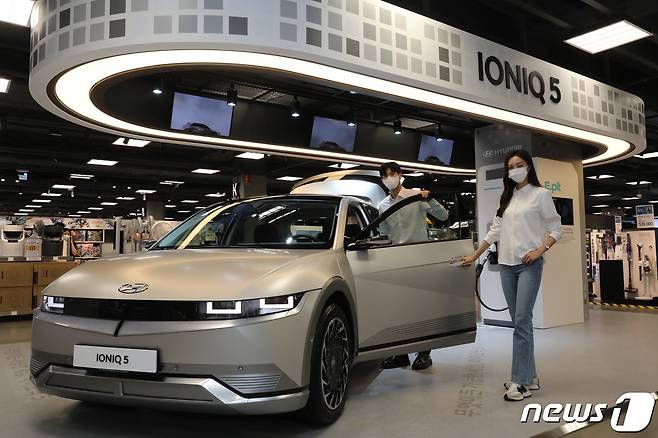 (서울=뉴스1) = 27일 오전 이마트 죽전점 일렉트로마트에서 모델들이 현대자동차의 전기차 '아이오닉5' 팝업 전시장을 소개하고 있다.