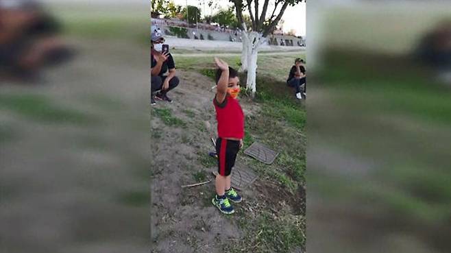 네 살 산티아고가 먼 곳을 바라보며 손을 흔듭니다.