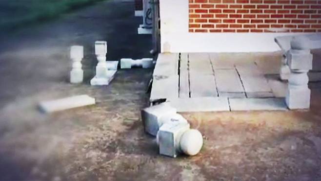 출입구 주변에 부서진 대리석 난간이 흩어져 있습니다.