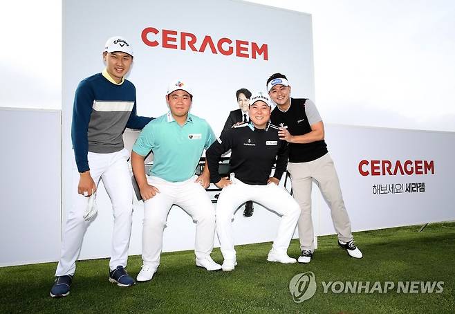 (서울=연합뉴스) 이유석(왼쪽부터), 김주형, 함정우, 박상현이 28일 전북 군산CC에서 열린 한국프로골프(KPGA) 군산CC 오픈 연습라운드 4번 홀 페어웨이에서 기념 촬영을 하고 있다. 2021.4.28