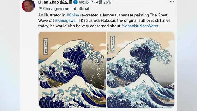 중국 외교부 대변인은 패러디물을 게시하면서 "호쿠사이가 살아 있었다면, 그 역시 오염수에 대해 매우 걱정했을 것"이라고 비아냥거리기도 했는데요.