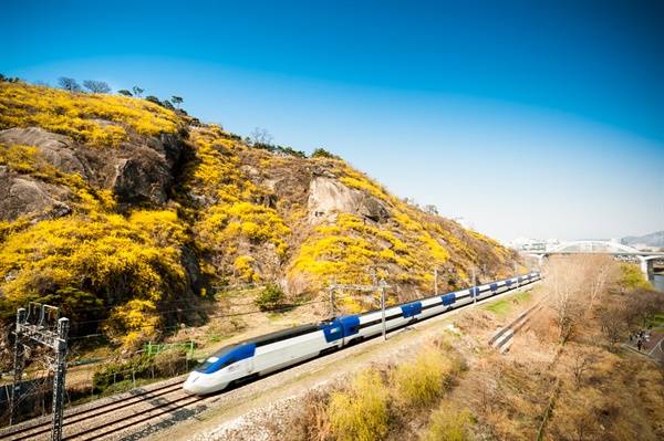 | ▲ 용비교에서 바라본 응봉산. 노란색 옷으로 갈아입은 응봉산을 열차가 지나가고 있다. |