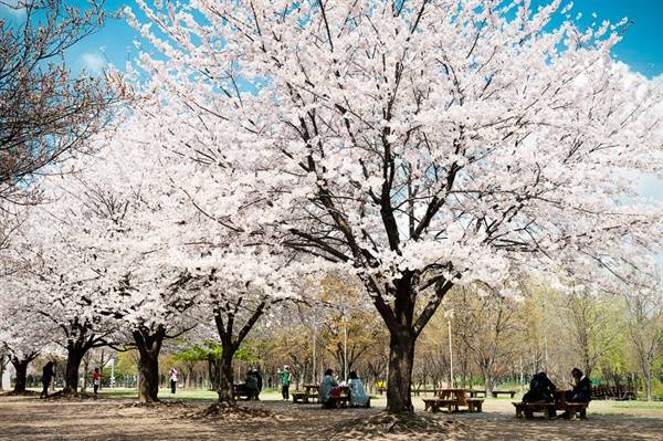 | ▲ 서울숲 잔디마당의 봄. 잔디마당 앞의 벚꽃이 수려하게 피어나 상춘객을 반긴다. |