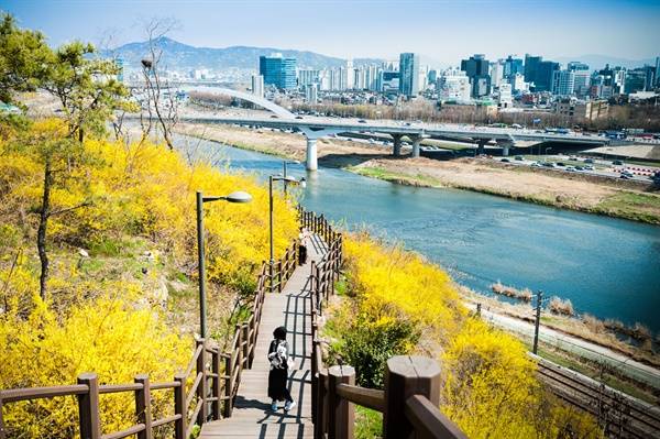 개나리 속에 푹 파묻혀 걷다 보면 경의-중앙선을 달리는 기차가 운치를 더해주는 용비교로 내려온다. 응봉산 정상에서 바라보는 한강 풍취도 좋고 이곳에서 감상하는 개나리 물결도 근사하다. 팔각정과 어우러진 푸른 하늘이 노랑색을 더욱 눈에 띄게 만들어주기 때문이다. 마주치는 열차를 뒤로하고 길을 나서면 금방 서울숲에 다다른다.