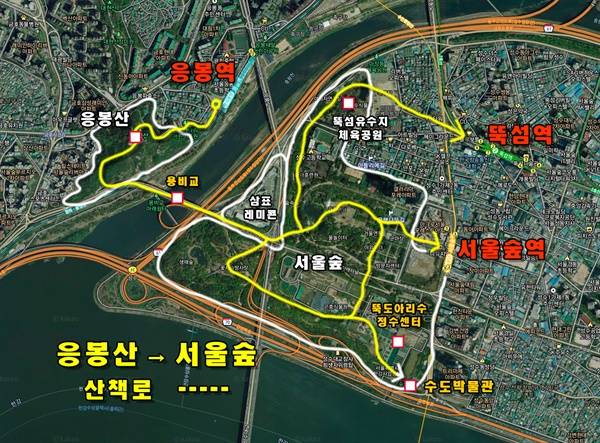 | ▲ 응봉산과 뚝섬 일대 지도. 3월이면 개나리 축제가 열리는 응봉산과 서울숲, 수도박물관 위치. |