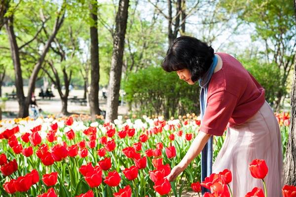 | ▲ 튜울립을 배경으로 멋진 포즈를 취해 준 박용자님. 서웊숲 수변 앞에 피어난 튜울립이 상춘객을 유혹하고 있다. |