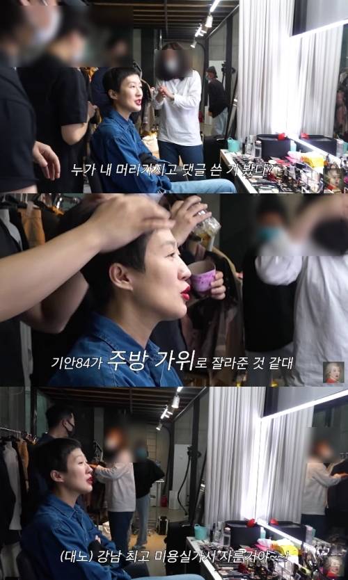 메이크업을 마친 홍진경은 이어 헤어 스타일링을 받았으며 홍진경은 “누가 내 머리가지고 댓글 쓴 것을 봤다. 기안84가 주방가위로 잘라준 것 같다더라”라고 고백해 현장을 초토화시켰다. 이에 PD가 직접 자른 것인지 묻자 홍진경은 크게 분노하며 “강남 최고 미용실 가서 자른 것이다”라고 대답했다.