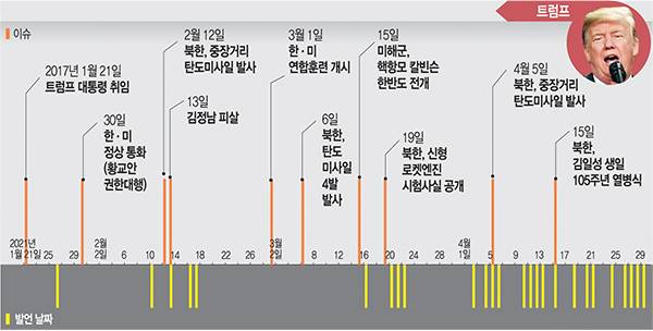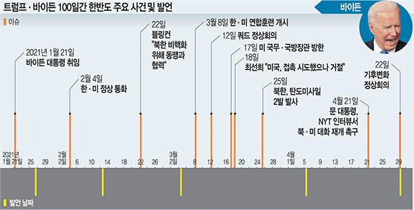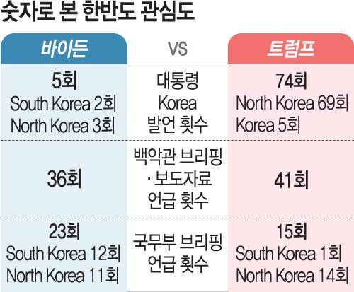 코리아를 언급한 날 수를 보면 한반도에 대한 전현직 미국 대통령의 관심도 차이가 더욱 분명히 나타난다. 트럼프 전 대통령이 취임 후 첫 100일 동안 코리아를 언급한 날은 총 26일이었다. 나흘에 한 번 입에 올린 셈이다. 이에 반해 바이든 대통령은 100일 중 닷새에 불과했다.