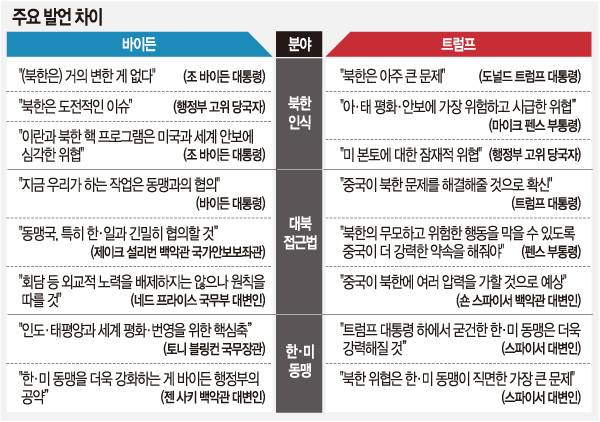 바이든 대통령은 북한 관련 발언을 애써 삼가려는 눈치도 엿보인다. 지난달 21일 북한이 단거리 순항미사일을 발사한 직후 기자가 관련 질문을 던졌지만 그는 주어를 생략한 채 "크게 달라진 게 없다"고만 했다. 트럼프 전 대통령은 후보 시절부터 김정은 국무위원장에게 일종의 개인적인 호감을 드러내 왔다. 반면 바이든 대통령은 북한 지도부와 관련해 최대한 관심을 주지 않으려는 태도를 보였다. 다소 즉흥적이고 다변가인 트럼프 전 대통령과 달리 말수가 적은 바이든 대통령의 스타일 차이도 있다.