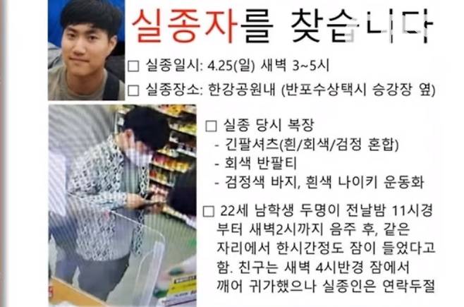 ◇ 김현정> 일각에서는 거기가 한강 근처니까, 술 마신 곳이. 안타까운 추정입니다마는 '물에 빠졌을 가능성이 있는 게 아니냐' 이런 이야기도 하고 또 일각에서는 '친구나 제3자하고 다툼이 있었던 건 아니겠느냐' 얘기도 하고 여러 가지 얘기들이 나오는 상황 아니겠습니까? 가능성을 열어둔 상황.
