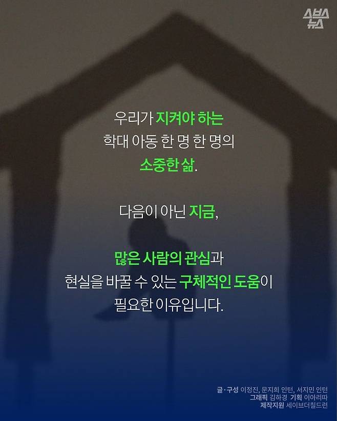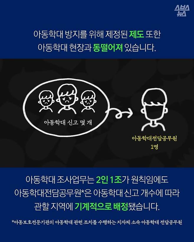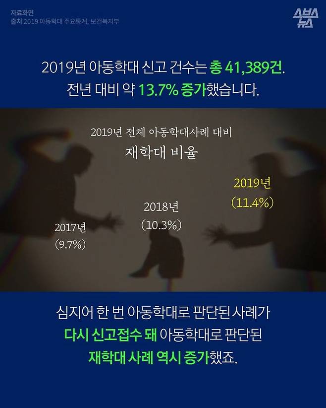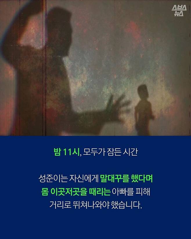 밤 11시, 모두가 잠든 시간. 적막한 거리 위에 등장한 한 그림자가 있습니다. 아빠에게 쫓겨나 거리로 뛰어나온 아이 성준이입니다. 자신에게 대꾸를 하는 성준이가 맘에 들지 않았던 아빠는 성준이의 몸 이곳저곳을 때렸습니다. 성준이에게 가해진 행위, 아동학대는 옆집, 앞집, 심지어 다른 지역에서도 계속해서 늘어나고 있습니다. 반복해서 일어나는 아동학대, 우리는 왜 이 문제를 아직도 해결하지 못하는 걸까요? 그 이유를 스브스뉴스가 알아봤습니다.