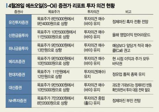 대신증권은 매수를 유지하며 목표주가 역시 10만5000원으로 10.5% 상향했지만, 투자 시점에 대해서는 신중함을 전했다. 한상원 대신증권 연구원은 "실적 추정 변경에 따라 목표주가를 상향 제시했지만 결국 정유 사업의 회복의 속도가 관건"이라면서 "당장의 과도한 기대보다는 정제마진 반등을 확인하면서 대응하는 전략이 유효하다"고 조언했다. 이어 "석유 수요와 정유 업화의 회복 방향성 자체는 분명하다고 판단한다"면서 "하반기에 항공유 수요 반전과 함께 정제마진의 유의미한 반등을 기대한다"고 덧붙였다.