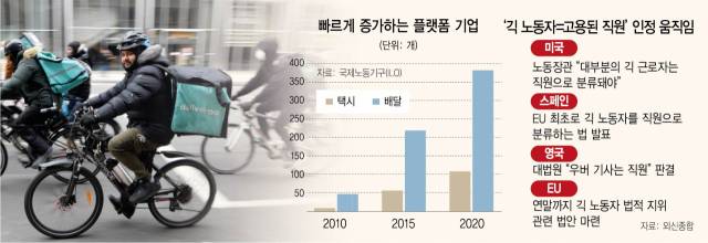 코로나19가 플랫폼 노동자의 법적 지위를 둘러싼 논의의 패러다임을 바꾸고 있다. 코로나19 이전에는 개별 기업의 노동자 집단이 자신들을 개인사업자가 아닌 고용된 직원으로 인정해달라고 소송을 제기했고 기업들은 개별적으로 대응했다. 반면 이제는 정부가 업종에 상관없이 모든 플랫폼 노동자의 고용 지위를 안정화하려는 움직임이 나타나고 있다. 코로나19로 플랫폼 노동자가 대폭 증가하면서 이들의 불안정한 고용 지위가 부각돼 근로자로 인정하는 국가도 늘어나는 추세다. 반면 플랫폼 기업들은 노동자들의 고용조건을 두고 타협할 기회라도 달라며 반발하고 있다.