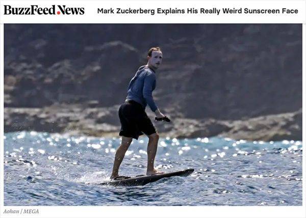 지난해 여름 하와이에서 휴가를 즐기던 저커버그는 서핑하는 사진으로 온라인에서 큰 화제를 모았습니다. 파도 위에 있는 그가 마치 흰색 가면을 쓴 것처럼 선크림을 과하게 바른 모습이었기 때문입니다.