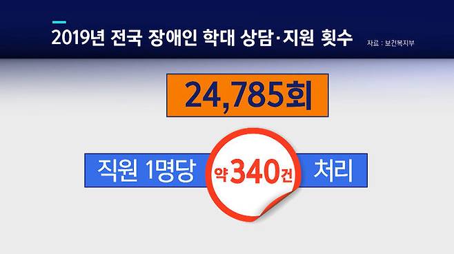이러한 장애인권익옹호기관은 전남뿐 아니라 전국 17개 광역 지자체에 분포돼 있다. 2015년 6월, 장애인복지법 개정으로 설치 근거가 마련되면서 지난 2017년 보건복지부 산하 중앙장애인권익옹호기관이 서울에 처음 문을 열었다. 중앙정부와 지자체가 비영리법인과 공공기관에 위탁 운영하는 구조다. 문제는 지원이다. 사실상 장애인 학대에 관한 업무를 전담하다시피 하고 있지만 여건은 열악하기 그지없다. 전국 17개 기관에 근무하는 직원 70여 명이 지난 2019년 상담 또는 지원한 학대 의심사례는 모두 24,785회에 달한다. 직원 1명당 약 340여 건의 사례를 처리하는 셈이다.