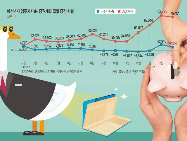 가정의 달은 5월이지만 재테크 측면에서 본다면 올해는 2월로 보는 게 나을 수도 있겠다. 그만큼 지난 2월은 좀 ‘이상한’ 달이었다. 지난해 코로나19로 직격탄을 맞은 이후 미성년자 입주자저축(청약통장)과 증권계좌 월별 증감률을 살펴보니 두 계좌 모두 지난 2월 신규 가입이 급등했기 때문이다.