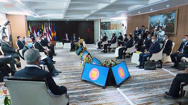 지난달 24일 특별정상회의 후 발표된 아세안 의장 성명 6항에는 "아세안 외교장관들은 제54회 외교장관회의에 앞서 가능한 한 빨리 중국, 미국과 회담할 것을 지시했다"고 명시돼 있습니다.