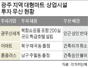 이마트는 2010년까지 광주에서 다섯 곳으로 점포를 늘린 뒤 북구 매곡동에 추가 출점에 나섰다. 북구청으로부터 건축허가까지 받았지만 광주시의 건축허가 취소 조치와 구청을 상대로 한 소송전 끝에 더는 영업망을 늘리지 못했다. 홈플러스는 2000년 남구 주월동에 출점을 노렸지만 남구청이 10년 동안 일곱 차례에 걸쳐 승인을 불허하면서 2010년 끝내 출점을 포기했다. 롯데슈퍼는 2019년 말까지 여덟 곳이었던 광주 지역 점포 수를 작년에 다섯 곳으로 줄였다.