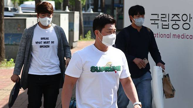 메이저리그 출신의 추신수와 경기 도중 불규칙 바운드에 코뼈가 골절된 황재균도 코에 큰 반창고를 붙이고 건강한 모습으로 접종을 마쳤습니다.