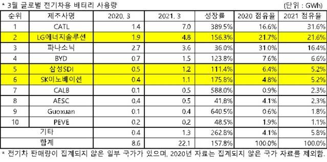 에너지 시장 조사업체 SNE리서치는 3일 2021년 1분기 및 3월 판매된 글로벌 전기차(EV, PHEV, HEV) 탑재 배터리 사용량 순위에서 LG에너지솔루션이 2위, 삼성SDI가 5위, SK이노베이션이 6위를 기록했다고 밝혔다.