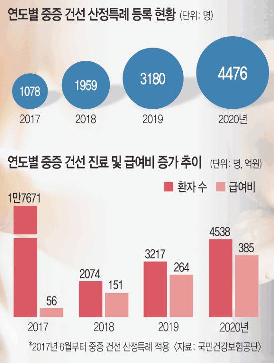 공단에 따르면 중증 건선 산정특례 등록자는 2017년 1078명, 2018년 1959명, 2019년 3180명, 2020년 4476명으로 꾸준히 늘었다. 최근 2년간 연평균 51.5% 증가했다. 중증 건선 진료 환자도 2016년 2만542명, 2017년 1만7671명이었는데 산정특례 적용 후 2018년 2074명으로 줄었다가 2019년 3217명, 2020년 4538명으로 다시 증가했다. 건보 급여비 또한 2016년 53억원, 2017년 56억원 수준에서 산정특례 후 2018년 151억원, 2019년 264억원, 2020년 385억원으로 껑충 뛰었다.