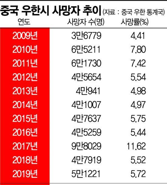 한편 2014년부터 2019년(2017년 제외)까지 5년간 중국 우한시 평균 사망률은 5.48%다.